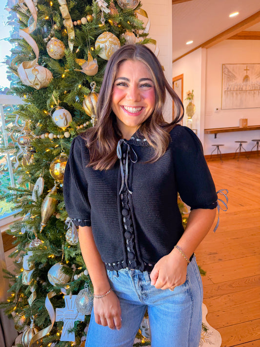SHORT PUFF SLEEVE BUTTON DOWN SWEATER