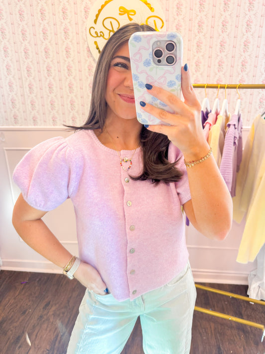PUFF SLEEVE CREW NECK KNIT TOP - PINK
