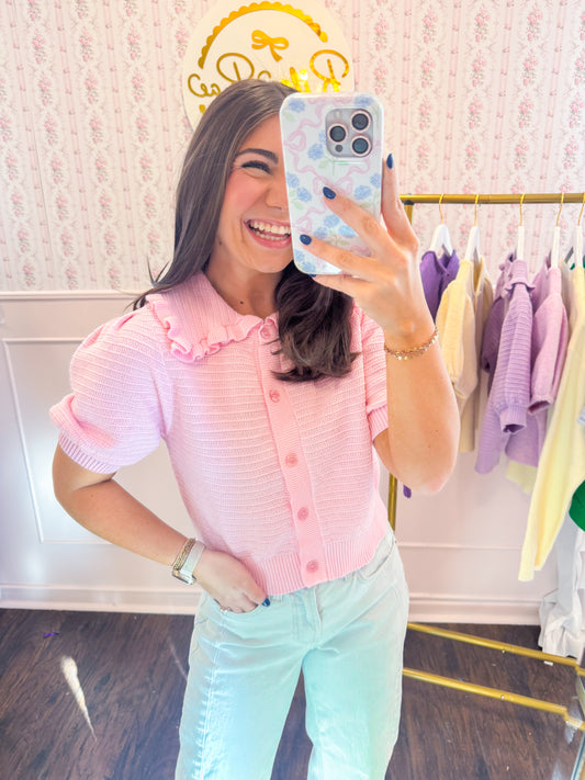 RIBBED KNIT RUFFLE COLLAR TOP - BABY PINK