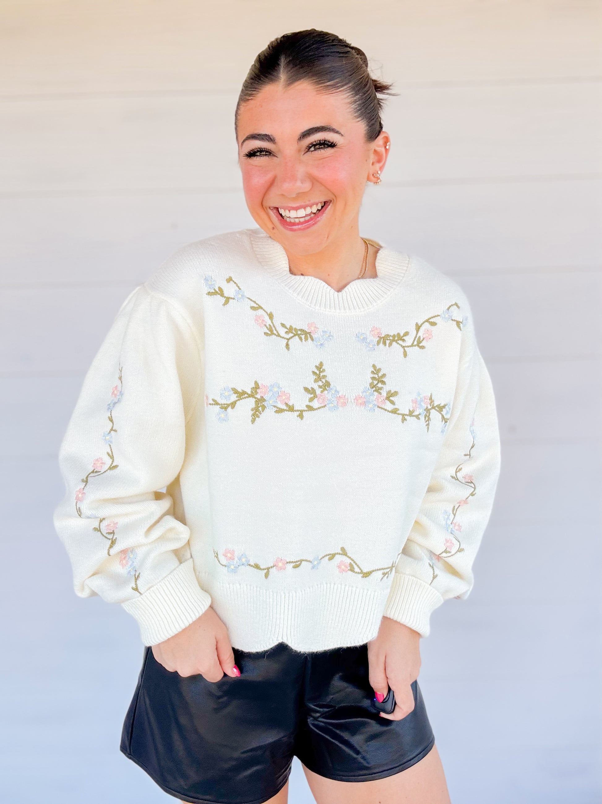 EMBROIDERED SCALLOP DETAIL KNIT TOP