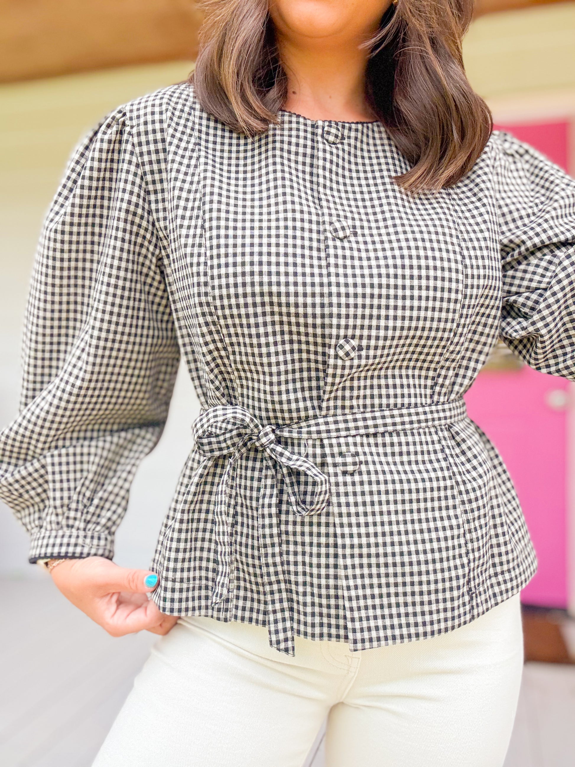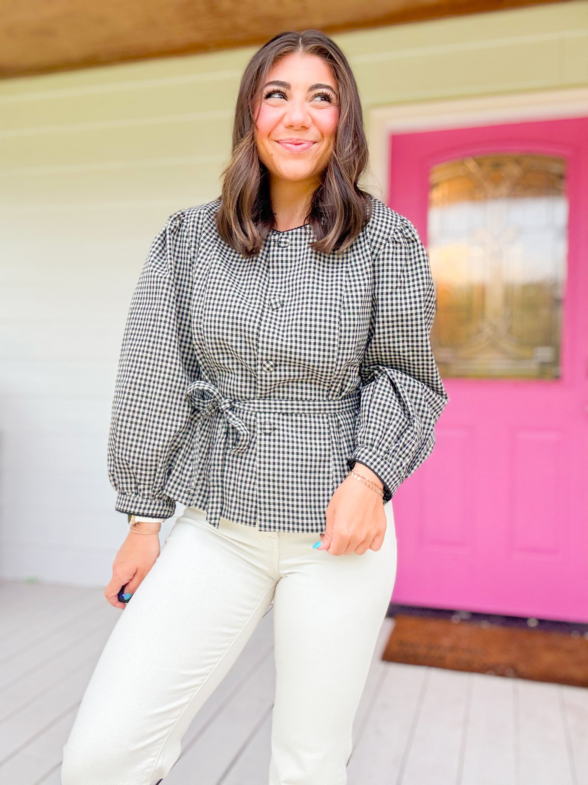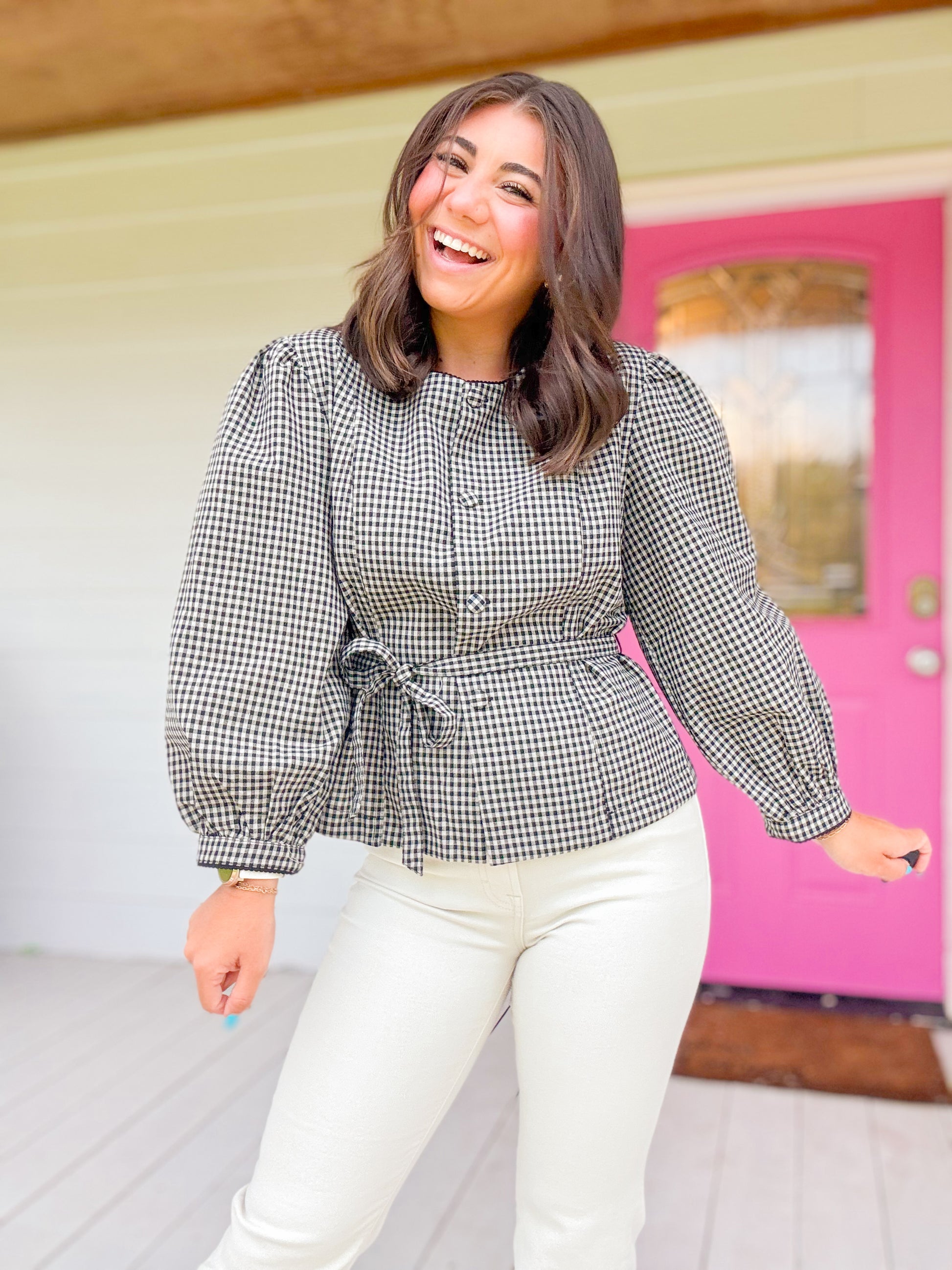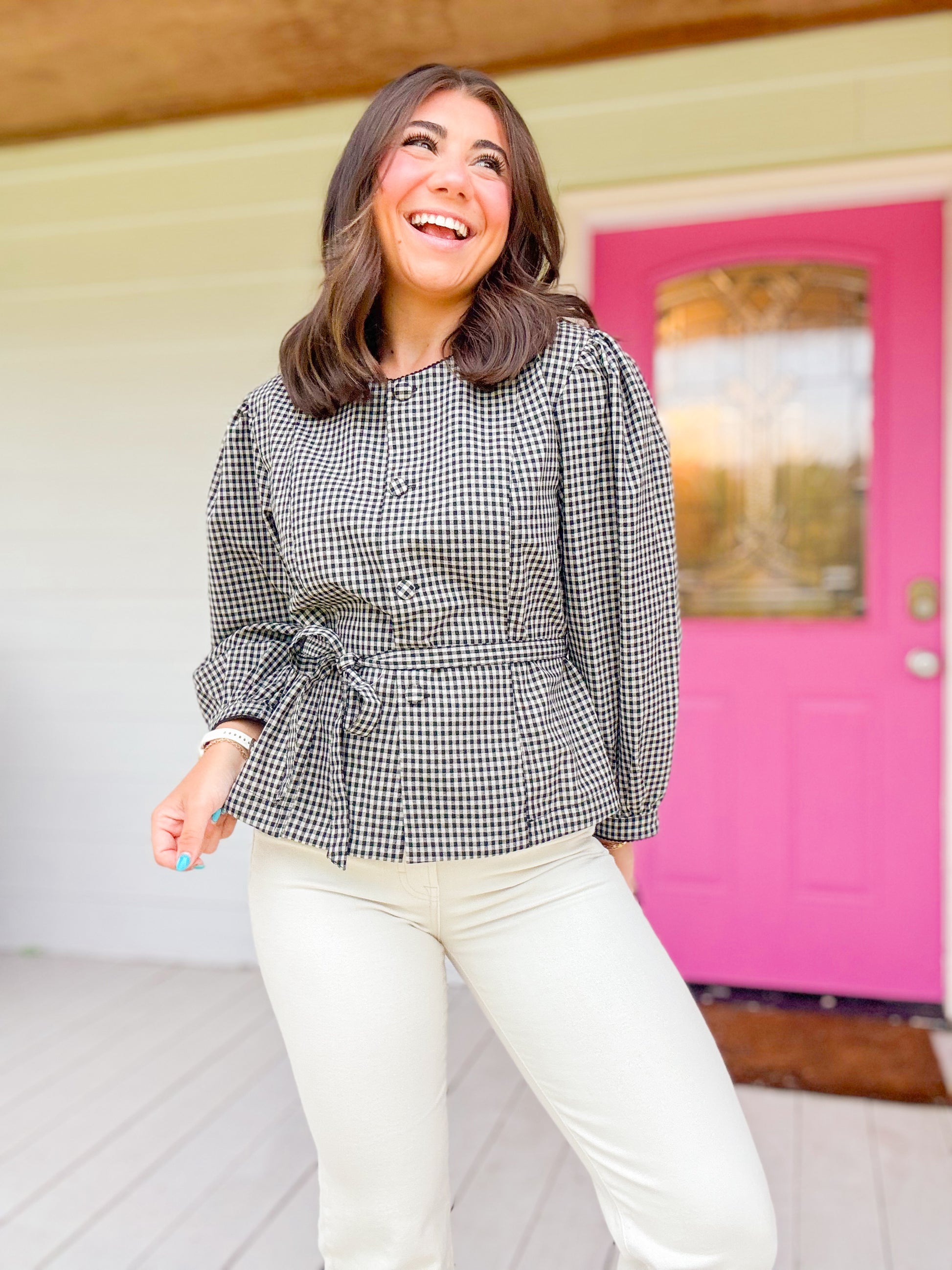 PUFF SLEEVE WRAP TIE PLAID TOP