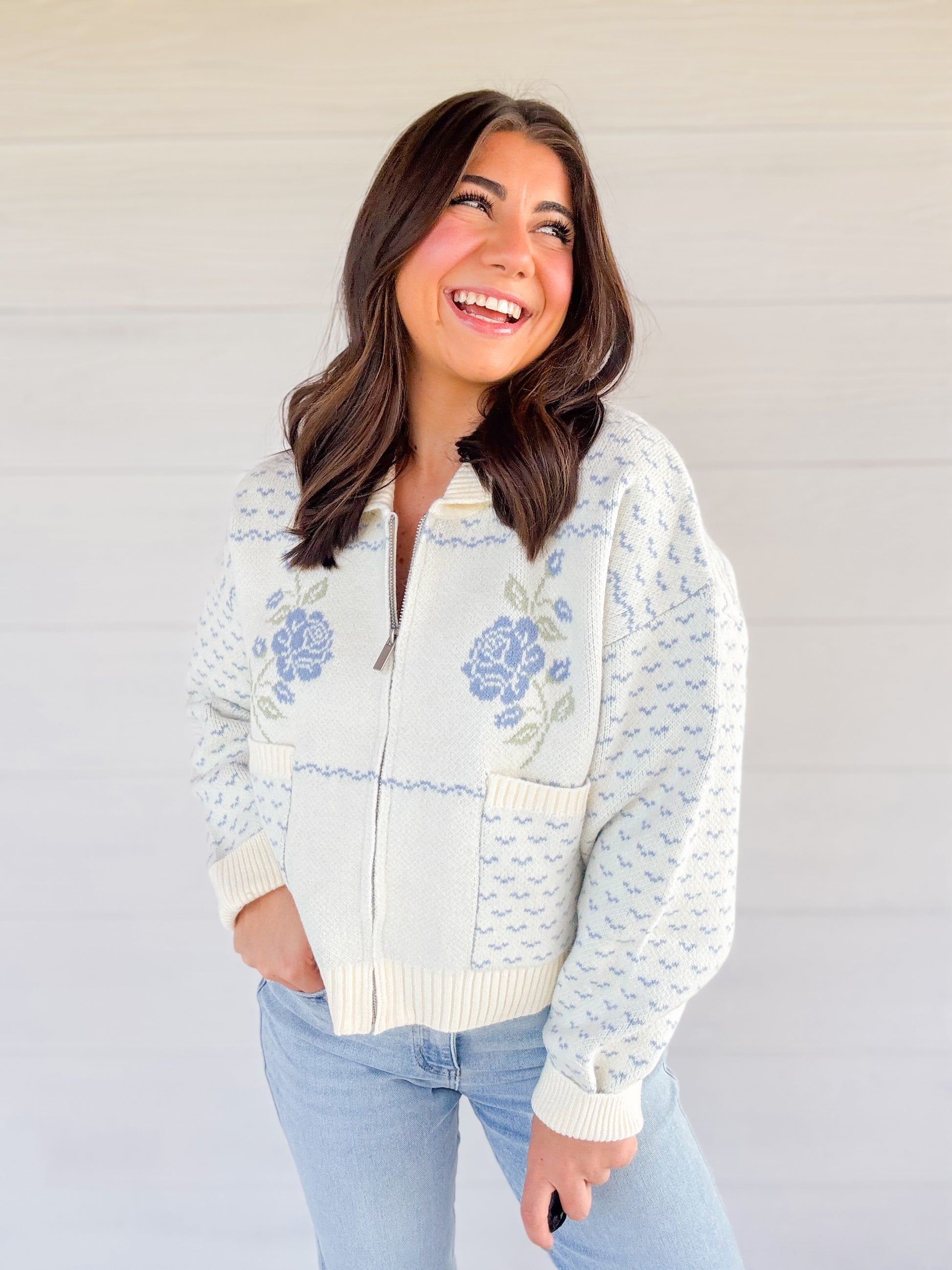 ROSE JACQUARD KNIT ZIP UP JACKET - BLUE